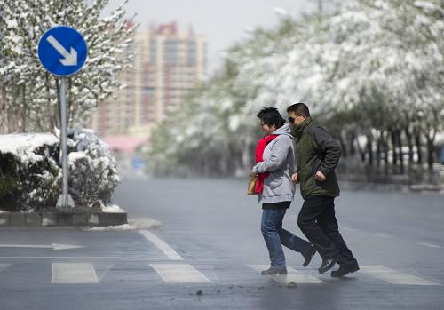 4月23日,市民走在人行横道上,雪后的路面上升起白雾。新华社记者 江文耀 摄 |
