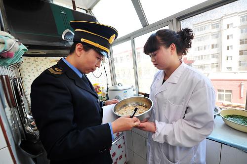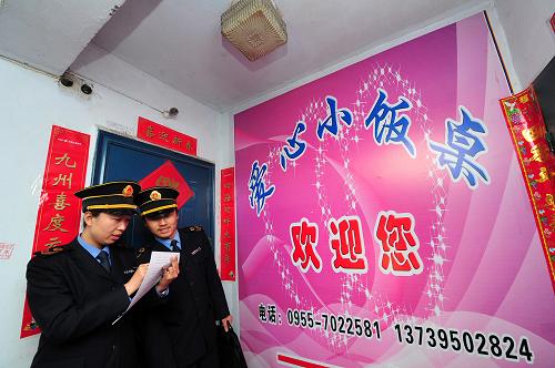 4月23日,在宁夏回族自治区中卫市,市食品药品监督管理局的执法人员在对一处校园附近的“小饭桌”进行抽查登记。近日,针对校园周边存在的食品安全隐患,宁夏回族自治区开展了校园周边食品整治工作,各地市相关部门组织执法人员对全区310家“小饭桌”进行了调查摸底,备案登记191家,通过隐患排查,责令188家存在不同程度食品安全隐患的“小饭桌”限期整改,取缔了3家存在较大安全隐患的“小饭桌”。同时,对校门两侧100米范围内的流动摊贩进行全面清理,将有一定设备条件和卫生条件的食品摊贩,指定在划定区域内从事食品经营活动。新华社发 (彭昭之 摄)
