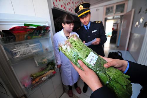 4月23日,在宁夏回族自治区中卫市,市食品药品监督管理局的执法人员在对一处校园附近的“小饭桌”采购的蔬菜进行检查。新华社发 (彭昭之 摄)