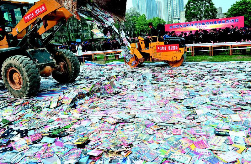 4月24日,随着重型压路机的吱呀吱呀声,49.7万件侵权盗版及非法出版物被销毁。当日,“2014全国侵权盗版及非法出版物集中销毁”活动陕西分会场在咸阳举行,全省49.7万余件侵权盗版及非法出版物被彻底销毁。