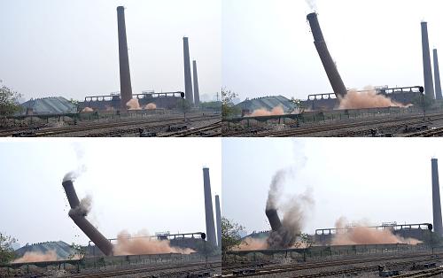 4月25日,在河北省邯郸市复兴区原星光锌业工厂内,一根50米高,使用了20多年的烟囱被爆破拆除(拼版照片)。