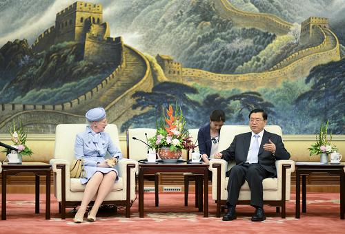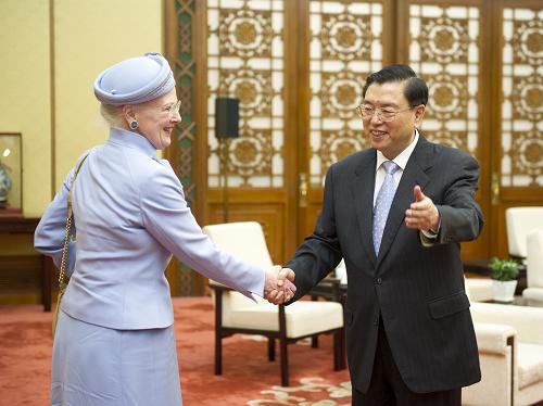 4月25日,全国人大常委会委员长张德江在北京人民大会堂会见丹麦女王玛格丽特二世。新华社记者 谢环驰 摄