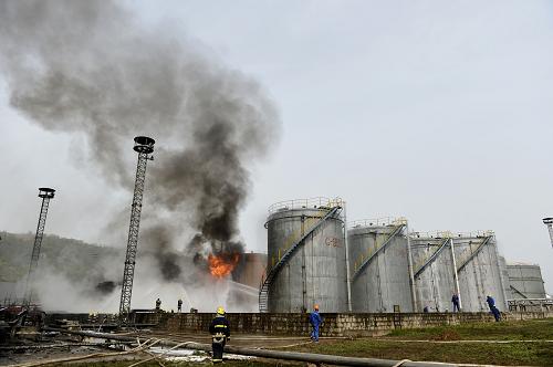4月26日,在陕西延长石油集团炼化公司延安炼油厂轻质油储存罐闪爆着火事故现场,消防官兵正在全力扑火。新华社记者 刘潇 摄