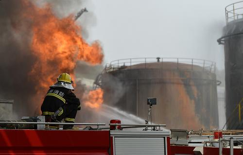 4月26日,陕西延长石油集团炼化公司延安炼油厂轻质油储存罐闪爆着火事故现场,一名消防官兵在观察远处的火势。新华社记者 刘潇 摄
