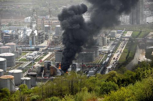 4月26日,在陕西延长石油集团炼化公司延安炼油厂轻质油储存罐闪爆着火事故现场,消防官兵正在全力扑火。当日凌晨1点48分,陕西延长石油集团炼化公司延安炼油厂3个轻质油储存罐发生闪爆着火事故。初步了解有3人烧伤,伤者现已得到及时救治。黄陵县阿党镇600多名群众、洛川县交口河镇交口河村300多名群众,已从事故现场周边全部安全撤离。延安市环保局已启动应急预案,在洛河上游已设置五道拦截坝,并组织力量在现场进行监测评估,以防止对洛河水体造成污染。截至记者发稿时,火势已基本控制,具体伤亡情况和事故发生原因正在进一步调查中。新华社记者 刘潇 摄