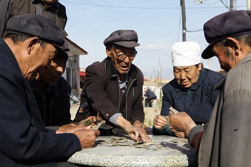 4月27日,在河北蔚县北门子村互助养老幸福院,老人们在一起打牌。新华社记者 巩志宏 摄