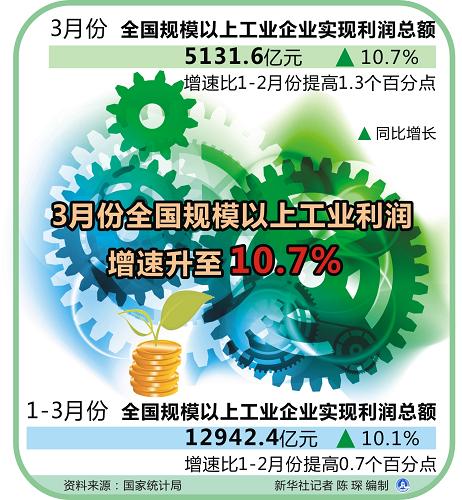 图表:3月份全国规模以上工业利润增速升至10.7% 新华社记者 陈琛 编制