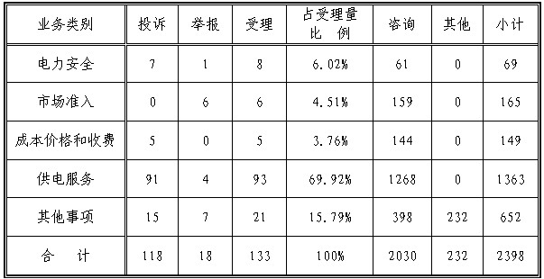 (二)投诉举报办理情况 根据国家有关法律法规规定,对2014年3月收到的136件投诉举报中的133件进行了受理,占投诉举报量的97.79%;不属于监管职责范围的3件不予受理,占投诉举报量的2.21%。 到2014年3月31日,3月份受理的投诉举报办理完毕72件,占3月份投诉举报受理量的54.13%;未办结64件结转2014年4月办理,占3月份受理量的48.12%。 (三)业务分类情况 在2014年3月收到的2398件有效信息中,供电服务1363件,成本价格和收费149件,市场准入165件,电力安全69件,其他事项652件。 在2014年3月收到的136件投诉举报中,供电服务方面95件,受理93件,占受理量的69.92%;电力安全方面8件,受理8件,占受理量的6.02%;市场准入方面6件,受理6件,占受理量的4.51%;成本价格和收费方面5件,受理5件,占受理量的3.76%;其他事项方面22件,受理21件,占受理量的15.79%。(2014年3月有效信息按业务分类情况见表二) 表二 2014年3月有效信息按业务分类情况 (单位:件)