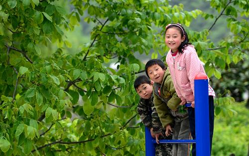 4月27日,几个孩子在甘肃省康县白杨乡吊石坝村的健身器械上玩耍。