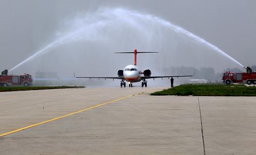 4月28日,国产ARJ21-700新支线飞机104架机抵达西安阎良中航工业试飞中心。新华社记者 (丁汀 摄)