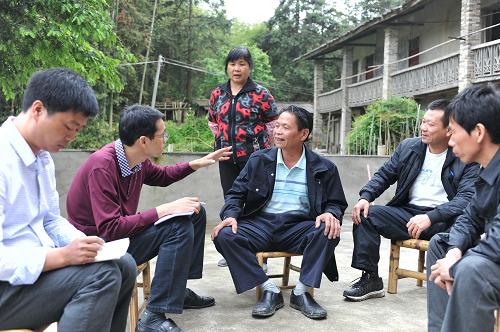 4月30日,闽侯县纪检干部王爱浩(左二)等在洋里乡洋头村向村民周继榕(右三)了解包村干部是否有“吃拿卡要”现象。新华社记者 林善传 摄