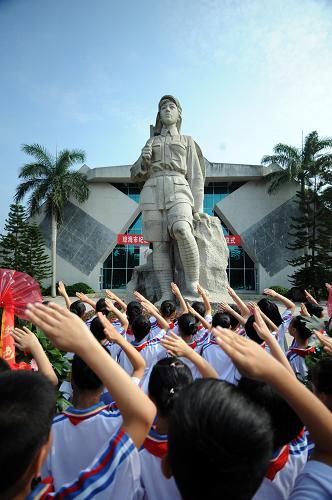 4月30日,少先队员在红色娘子军纪念馆瞻仰红色娘子军塑像。当日,纪念红色娘子军成立83周年敬献花篮仪式在红色娘子军发源地——海南省琼海市举行,各界代表400余人参加仪式并瞻仰红色娘子军塑像。新华社发(夏一方摄)