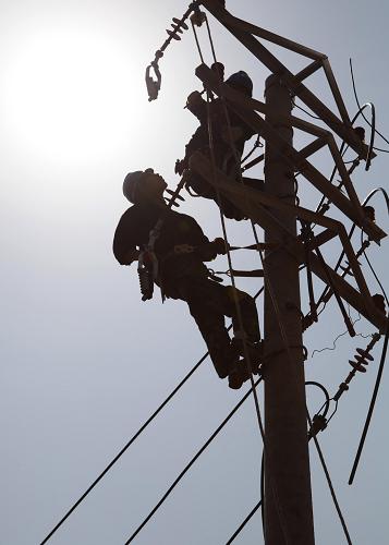 4月30日,国网山东即墨市供电公司施工人员在工业园区架设线路。新华社发(江泽灏 摄)