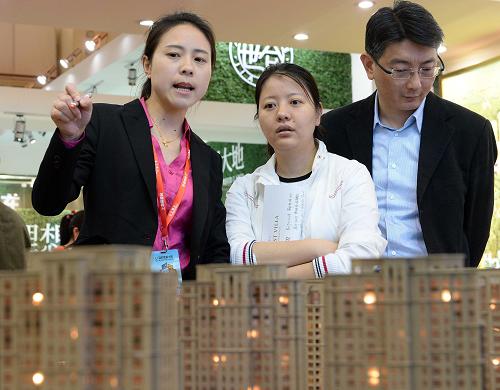 4月30日,工作人员在上海“五一假日楼市”上向市民推荐楼盘。当日,“五一假日楼市”2014上海房展会在上海市展览中心开幕,200多家房地产开发商、代理商及移民机构参展,集中展示了500多个房地产项目。房展会将持续至5月3日。新华社发(赖鑫琳 摄)