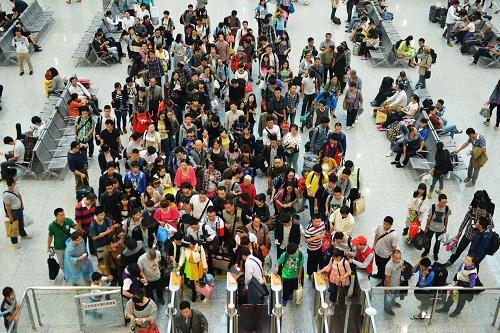 5月3日,旅客在杭州铁路东站大厅排队检票。新华社发(龙巍 摄)