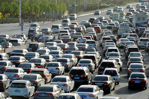 5月3日,车辆在G4京港澳高速公路石家庄裕华路口缓慢通行。当日是“五一”小长假最后一天,河北省境内多条高速公路迎来返程车流高峰。新华社(朱旭东 摄)