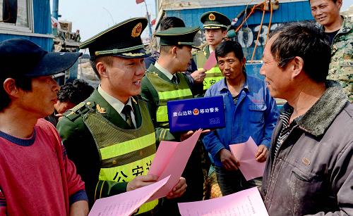 河北边防民警送安全到一线。5月7日,河北省唐山市南堡边防派出所民警在向辖区渔民发放安全知识宣传材料。时下正值渤海湾地区捕捞旺季,河北省唐山市公安边防支队专门组织基层民警深入到辖区渔港码头,开展为期一个月的“安全防范进渔港”专项宣传活动,把安全生产操作常识、遇袭防范知识等送到渔民生产一线,提高群众防抢、防盗、防诈骗、防事故意识,积极构建“全民参与,警民联动”的治安防控体系。新华社记者 杨世尧 摄