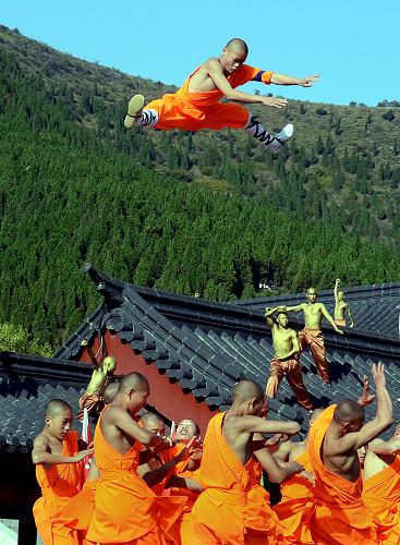 在第九届中国郑州国际少林武术节迎宾式上, 一群“少林小子”在为游客表演少林功夫。“少林功夫”已被列入国家级非物质文化遗产名录(2012年10月22日摄)。新华社记者 王颂 摄