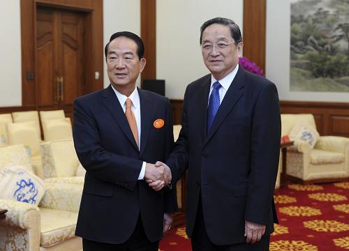 5月7日,中共中央政治局常委、全国政协主席俞正声在北京钓鱼台国宾馆会见亲民党主席宋楚瑜一行。新华社记者 张铎 摄