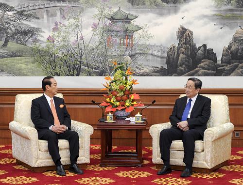 5月7日,中共中央政治局常委、全国政协主席俞正声在北京钓鱼台国宾馆会见亲民党主席宋楚瑜一行。新华社记者 张铎 摄