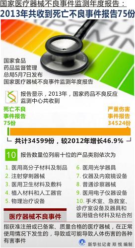 图表:国家医疗器械不良事件监测年度报告:2013年共收到死亡不良事件报告75份新华社记者 郑悦 编制