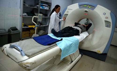患者在河北省承德县医院接受CT检查(5月8日摄)。