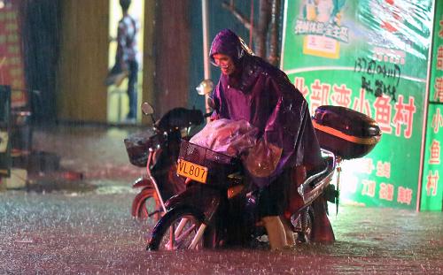 5月10日晚,广西桂林市全州县城一路段积水严重,市民在积水中骑行。新华社发(王滋创 摄) |
