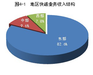 1-4月份,东、中、西部地区快递业务收入的比重分别为82.6%、9.6%和7.8%,业务量比重分别为81.1%、11.1%和7.8%。与去年同期相比,东部地区快递业务收入比重持平,快递业务量比重上升了0.6个百分点;中部地区快递业务收入比重上升了0.2个百分点,快递业务量比重下降了0.4个百分点;西部地区快递业务收入比重下降了0.2个百分点,快递业务量比重下降了0.2个百分点。
