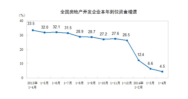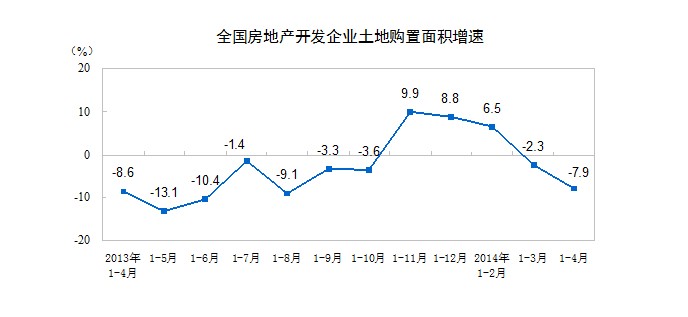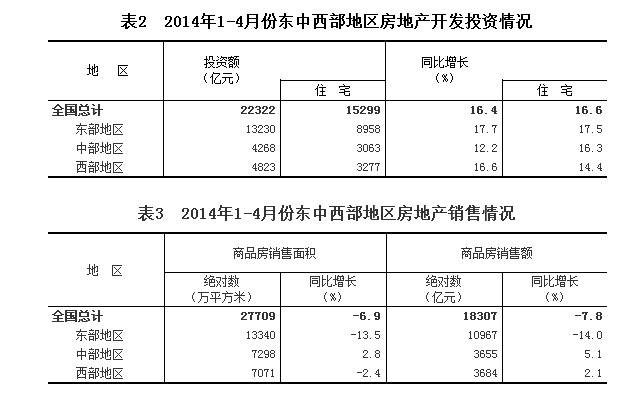 一、房地产开发投资完成情况 2014年1-4月份,全国房地产开发投资22322亿元,同比名义增长16.4%,增速比1-3月份回落0.4个百分点。其中,住宅投资15299亿元,增长16.6%,增速回落0.2个百分点,占房地产开发投资的比重为68.5% 1-4月份,东部地区房地产开发投资13230亿元,同比增长17.7%,增速与1-3月份持平;中部地区投资4268亿元,增长12.2%,增速回落3.4个百分点;西部地区投资4823亿元,增长16.6%,增速提高1.1个百分点。 1-4月份,房地产开发企业房屋施工面积564782万平方米,同比增长12.8%,增速比1-3月份回落1.4个百分点。其中,住宅施工面积405408万平方米,增长9.9%。房屋新开工面积43234万平方米,下降22.1%,降幅收窄3.1个百分点。其中,住宅新开工面积31184万平方米,下降24.5%。房屋竣工面积23685万平方米,下降0.3%,降幅收窄4.6个百分点。其中,住宅竣工面积17883万平方米,下降2.1%。 1-4月份,房地产开发企业土地购置面积8130万平方米,同比下降7.9%,降幅比1-3月份扩大5.6个百分点;土地成交价款2214亿元,增长9.6%,增速回落1.8个百分点。