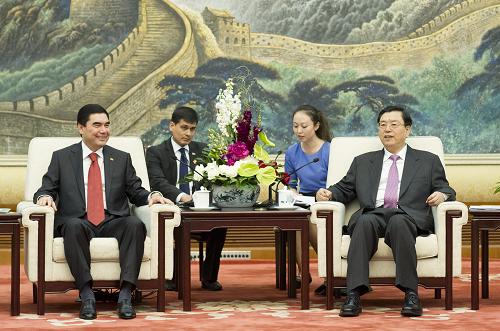 5月13日,全国人大常委会委员长张德江在北京人民大会堂会见土库曼斯坦总统别尔德穆哈梅多夫。新华社记者 黄敬文 摄