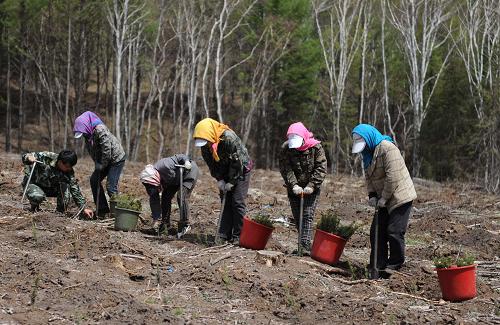 5月13日,在河北省塞罕坝机械林场总场,工作人员在植树。2014年,河北承德、张家口、唐山、廊坊、保定、沧州等环京津六市将造林293万亩,其中人工造林223万亩,封山育林70万亩,全力打造环京津森林带和生态涵养区。据河北省林业厅介绍,河北今年将大力推进京津风沙源治理、三北防护林等重点工程建设,扎实做好坝上防护林更新改造试点工作,加快构筑环京津生态林带。新华社记者 王晓 摄