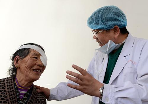 5月14日,来自内地的眼科专家徐深(右)在向一位患者讲解保护眼睛的常识。当日,由九三学社中央组织开展的“亮康行动西藏行”复明手术在拉萨启动。这项慈善行动,将让100名藏族白内障患者重见光明。新华社记者 觉果 摄
