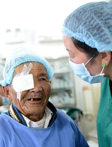 5月14日,西藏达孜县敬老院的孤寡老人索朗顿珠走出手术室。新华社记者 觉果 摄