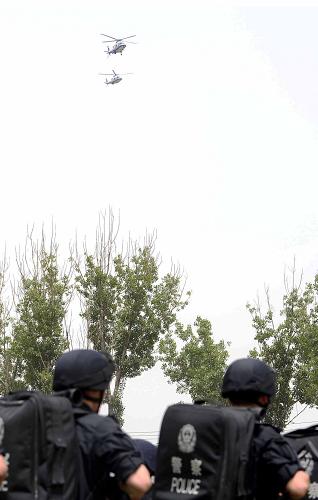 这是5月15日拍摄的反恐防暴演练现场。5月15日,北京警方出动30余辆特种车辆及警用直升机进行反恐防暴拉动演练,以检验首都公安机关反恐防暴处突的快速反应能力。北京警方负责人说,此次参加演练的车辆包括处突、指挥、防爆、运兵、破拆、水炮,以及发电、炊事、卫星等多种用途的警用特种车辆,代表了北京警方反恐车辆装备保障水平。新华社记者 李文摄