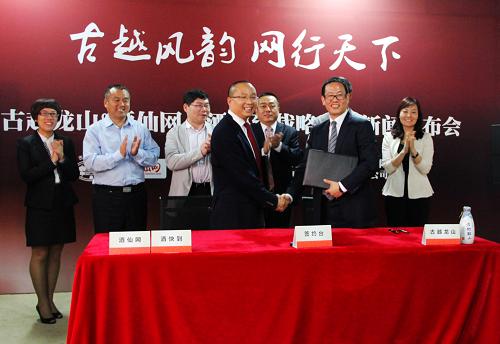 5月15日,在古越龙山与酒仙网战略合作新闻发布会上,双方代表在签署战略合作协议后握手。新华社发 |