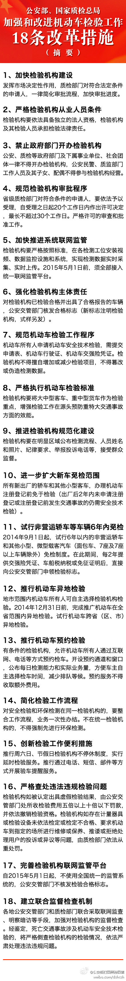 5月16日上午,公安部、国家质检总局召开电视电话会议,部署加强和改进机动车检验工作,推进检验制度改革。针对当前机动车检验工作中存在的问题,两部门联合下发《关于加强和改进机动车检验工作的意见》,进一步创新体制机制,着力破解车检难题,积极回应群众呼声,推出试行非营运轿车6年内免检、推行机动车异地检验、全面推进检验机构社会化、加强检验监督管理、强化违规违法责任追究等一系列新举措,推进机动车检验工作更加严格、规范,让人民群众感到更加便捷、满意。 机动车检验直接关系到道路交通安全,关系到人民群众切身利益。《道路交通安全法》实施10年来,面对成倍增长的机动车带来的压力,各级公安、质量监督部门密切配合,不断完善制度、规范程序、改进监管,保障了车检工作的有效开展。全国平均每年检验汽车7000多万辆次,及时发现严重安全隐患车辆300多万辆,对预防和减少道路交通事故发挥了重要作用。但随着机动车保有量激增,检验供需矛盾日趋加剧,检验工作中的问题日益凸显,不严格、不规范、不方便的问题比较突出,一些地方还存在政企不分、监管不力、执法不廉的情况。去年以来,公安部、国家质检总局结合开展党的群众路线教育实践活动,在深入调查研究、广泛听取意见建议的基础上,研究形成了《关于加强和改进机动车检验工作的意见》,近日已印发各地。 《意见》从严格资质管理、规范检验行为、改进便民服务、强化监督管理四个方面,提出了18项深化车检体制机制改革的措施。《意见》明确,要适应当前汽车保有量大幅增长的形势,发挥市场在资源配置中的决定性作用,加快检验机构建设,满足人民群众不断增长的检车需求。质量监督部门对符合法定条件的申请人,一律简化审批流程,加快审批工作进度。全面推进检验机构社会化,公安、质量监督等政府部门及下属企事业单位、社会团体一律不得举办检验机构,公安民警、质量监督部门工作人员等相关人员不得以任何形式参与检验机构经营。2014年9月30日前,各级公安、质量监督部门要进行自查清理,对已经开办、参与或变相参与经营的,要立即停办、彻底脱钩或者退出投资、依法清退转让股份。 《意见》明确,进一步扩大新车免检范围,所有新出厂的轿车和其它小型、微型载客汽车,在办理机动车注册登记前,不再进行安全技术检验。2014年9月1日起,试行6年以内的非营运轿车和其他小型、微型载客汽车免检制度,每2年需要定期检验时,机动车所有人提供交通事故强制责任保险凭证、车船税纳税或者免征证明后,可以直接向公安机关交通管理部门申请领取检验标志,无需到检验机构进行安全技术检验。同时,推行机动车异地检验、预约检验、延时检验等多项便民服务措施。《意见》还进一步强化了检验机构主体责任,检验机构对检验结果承担法律责任,机动车检验合格标志上标注检验机构名称,接受社会监督和责任倒查。对机动车发生死亡交通事故的,经事故鉴定认定涉及机动车安全技术检验的,严格倒查检验机构的检验情况,依法严肃处理违法违规问题。 公安部副部长黄明强调,推进机动车检验改革,既是公安机关贯彻落实习近平总书记系列重要讲话精神的实际举措,也是提升服务群众能力的重要内容。各级公安机关要按照党的十八届三中全会关于全面深化改革的部署要求,以对人民群众高度负责和改革创新的精神,全面落实机动车检验改革的各项措施。要进一步处理好政府与市场的关系,改革态度要坚决,脱钩清退要彻底,坚决斩断利益关系,对不按规定脱钩、明脱暗不脱,或者以各种理由、借口不执行脱钩规定的,要立即停止检验,停止核发检验标志,对相关责任人员要严肃追责。要积极配合质量监督部门推动加快检验机构建设,及时掌握本地检验机构和检车需求的具体情况,提出符合实际的建设需求,对质检部门批准新设的检验机构,及时做好系统联网、业务监管等工作。要认真落实简化程序、提高效率的一系列便民服务新措施,保证实施过程不走样、效果不打折,真正让人民群众切身感受到改革带来的新变化、新实惠。要依法履行公安机关负责核发检验标志的职责,充分运用信息化科技手段,创新监管方式方法,严格违规问题问责追究,公安机关将会同质量监督部门对全国检验机构开展集中检查整治,坚决查处一批弄虚作假、刁难群众、管理混乱的检验机构,严惩一批内外勾结、公然卖证、坑蒙群众的不法人员。要教育全体公安民警恪守法治精神,坚守法治定力,严守法律底线,凡违法违纪的,该辞退开除的坚决辞退开除,该追究刑事责任的坚决追究刑事责任。 国家质检总局副局长魏传忠强调,机动车检验改革工作对于强化便民为民,加强检验监管,规范检验行为,保障机动车安全和人民群众生命财产安全,具有十分重要的意义。要认真履行法律法规赋予质量监督部门的职责,进一步加强检验机构管理,着力筑牢保障安全和为民服务基础,进一步改革检验机构管理模式,大力推进社会化和市场化步伐,进一步落实各项监管职责,加大检验机构监管工作力度,进一步增强服务意识,提高便民服务水平,切实把我国机动车安全技术检验工作提高到新的水平,为保证机动车驾驶安全与人民群众生命财产安全作出积极贡献。 据了解,公安部还将会同质检总局制定实施细则,修订相关