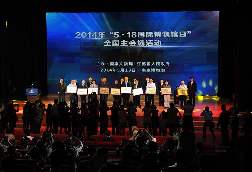 5月18日,第11届(2013年度)全国博物馆十大陈列展览精品评选的获奖单位代表在台上领奖。新华社记者 孙参 摄