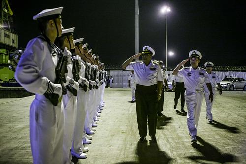 5月18日,在印度安德拉邦维沙卡帕特南港,中国海军郑和舰仪仗队列队等待甲板招待会宾客的到来。当天,正在印度安德拉邦维沙卡帕特南港访问的中国海军远洋航海训练舰郑和舰和导弹护卫舰潍坊舰组成的舰艇编队举行甲板招待会,中国驻印使馆官员、中印双方海军官兵及宾客进行了友好交流。新华社记者 郑焕松 摄