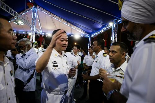 5月18日,在印度安德拉邦维沙卡帕特南港,中国海军郑和舰和潍坊舰编队指挥员韩小虎在郑和舰举行的甲板招待会上与印度海军官兵交谈。 当天,正在印度安德拉邦维沙卡帕特南港访问的中国海军远洋航海训练舰郑和舰和导弹护卫舰潍坊舰组成的舰艇编队举行甲板招待会。中国驻印使馆官员、中印双方海军官兵及宾客进行了友好交流。新华社记者 郑焕松 摄