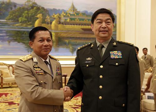 5月19日,中国国务委员兼国防部长常万全(右)在内比都会见缅甸国防军总司令敏昂莱大将。双方就发展两国两军关系、维护边境地区稳定等交换了意见。新华社发(吴昂摄)