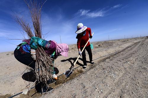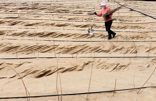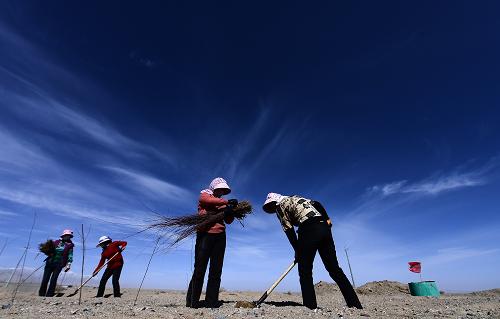 5月20日,两名工人在格尔木市荒漠化光伏产业园区的沙漠中种植红柳。2014年,青海省计划投入1.53亿元,在海西蒙古族藏族自治州格尔木市光伏产业园区开展造林治沙工程。据海西蒙古族藏族自治州林业局介绍,绿化项目覆盖面积近2.5万亩,其中枸杞经济林2万亩。项目实施将有效推动格尔木市荒漠化光伏产业发展区域生态环境治理。新华社记者 张宏祥 摄 5月20日,几名工人在格尔木市荒漠化光伏产业园区的沙漠中种植红柳。新华社记者 张宏祥 摄 5月20日,工人从格尔木市荒漠化光伏产业园区的沙漠中一处植有红柳的流动沙丘上走过。新华社记者 张宏祥 摄 5月20日,水滴从滴灌设备中流出,滋润着格尔木市荒漠化光伏产业园区的一棵杨树。新华社记者 张宏祥 摄 |