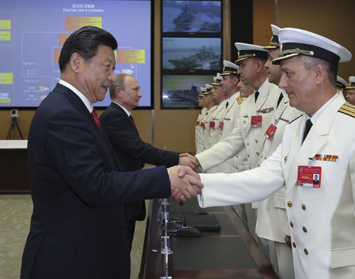 5月20日,国家主席、中央军委主席习近平在上海吴淞海军军港,同俄罗斯总统普京一起出席“海上联合-2014”中俄海上联合军事演习开始仪式并看望两国海军官兵代表。这是仪式开始前,习近平和普京与双方参演人员握手。新华社记者 兰红光 摄