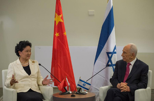 5月20日,以色列总统佩雷斯(右)在特拉维夫会见中国江南平台入口 副总理刘延东。 新华社记者李睿摄