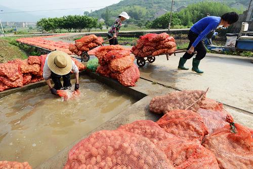 5月20日,在浙江舟山定海区金塘岛一农副产品运销公司,工人在清洗收购来的中药材贝母。近日,浙江舟山中药材贝母迎来丰收。根据今年市场行情,贝母收购价达每公斤42.6元,较去年上涨18元。贝母是金塘岛的特色农产品,全岛种植1750亩,今年预计可收获50万公斤。新华社发(姚峰 摄)