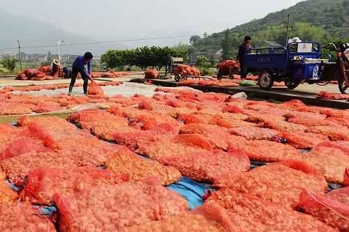 5月20日,在浙江舟山定海区金塘岛一农副产品运销公司,工人在翻晒收购来的中药材贝母。新华社发(姚峰 摄)