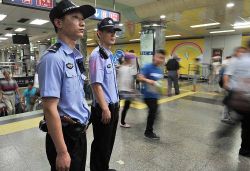 5月23日,配枪的两位民警在东单地铁站巡逻。新华社记者 李文 摄 |
