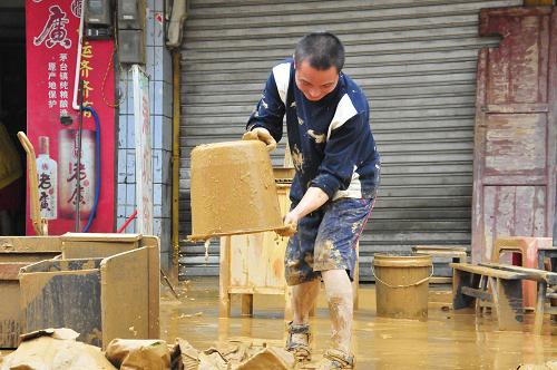 5月24日,石潭镇受灾群众在清理家中的淤泥。新华社记者 田建川 摄