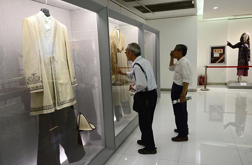 5月24日,两位参观者在参观吉尔吉斯斯坦民族刺绣品展。新华社记者 刘潇 摄