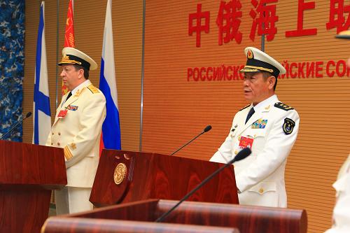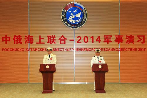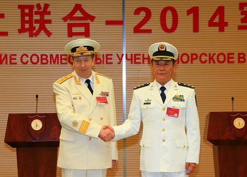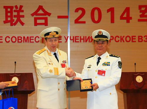 5月26日,中俄“海上联合—2014”军事演习结束仪式在上海某军港码头联合导演部举行。当日,中方总导演、中国海军副司令员田中海军中将与俄方总导演、俄罗斯海军副司令费多坚科夫海军中将,在设于上海某军港码头的联合导演部共同宣布:中俄“海上联合—2014”军事演习圆满结束。新华社记者 查春明 摄
