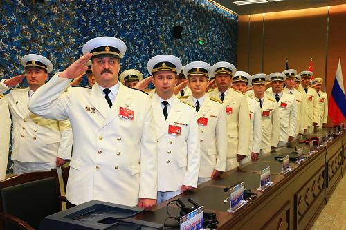 5月26日,俄罗斯海军参演军官代表在结束仪式上敬礼。新华社记者 查春明 摄